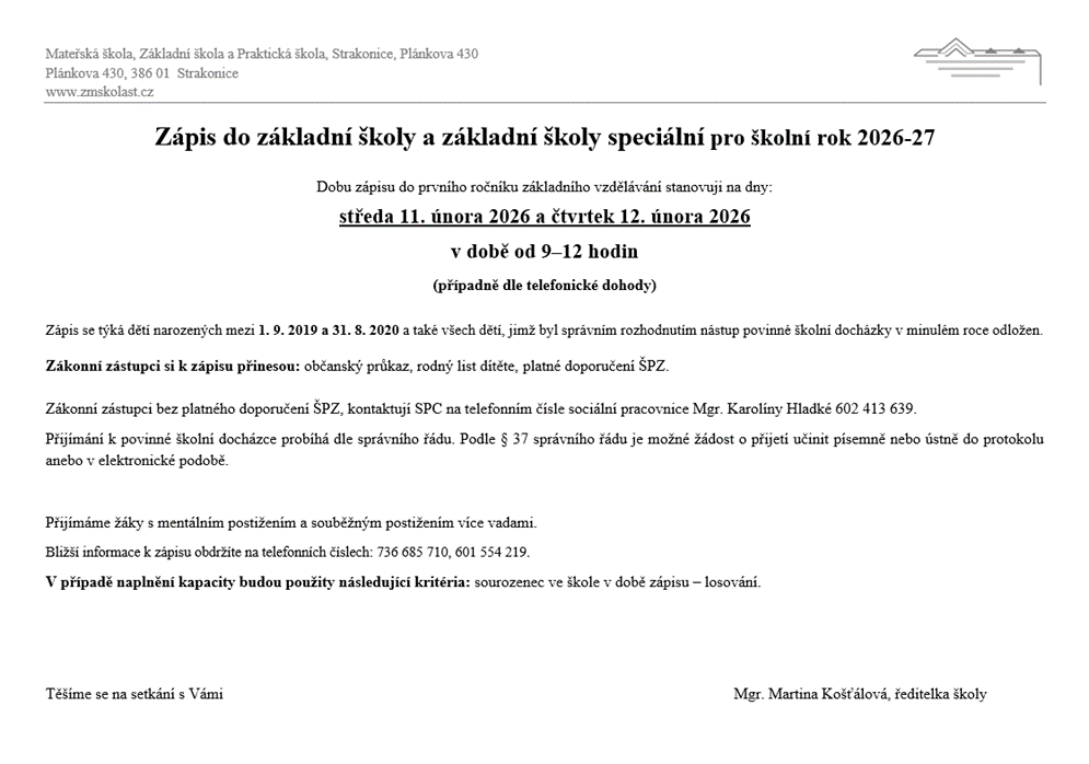 • zápis proběhne od 6. 5. do 28. 6. 2024, bližší informace a zápisní lístek obdržíte od vedoucí vychovatelky p. Nárovcové